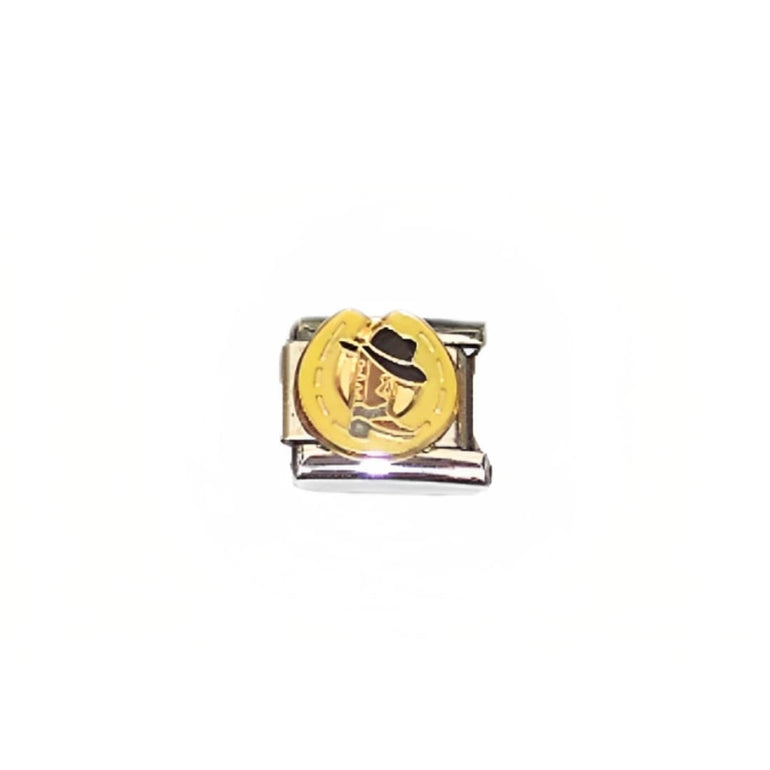 Your lookin' fer a boot-scootin' good time? Look no further than this charming combo of a cowboy hat and boots in a wild, yellow horse shoe Italian charm. Yeehaw!
